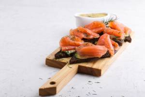 SALMÓN AHUMADO CON SALSA DE MOSTAZA Y ENELDO EN PAN DE CENTENO